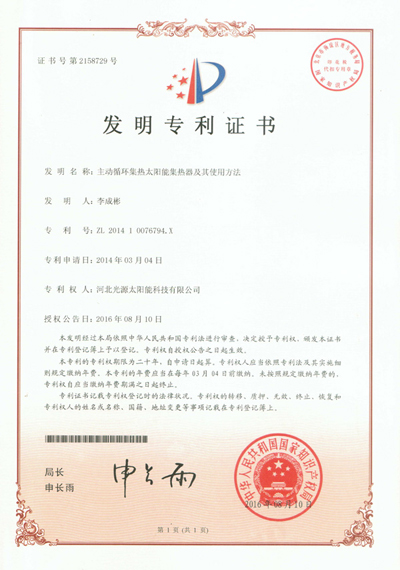 發(fā)明專利證書--主動(dòng)循環(huán)集熱太陽能集熱器及其使用方法