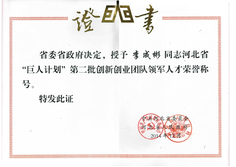 光源太陽(yáng)能董事長(zhǎng)李成彬,被授予河北省“巨人計(jì)劃”第二批創(chuàng)新創(chuàng)業(yè)團(tuán)隊(duì)領(lǐng)軍人才榮譽(yù)證書(shū)