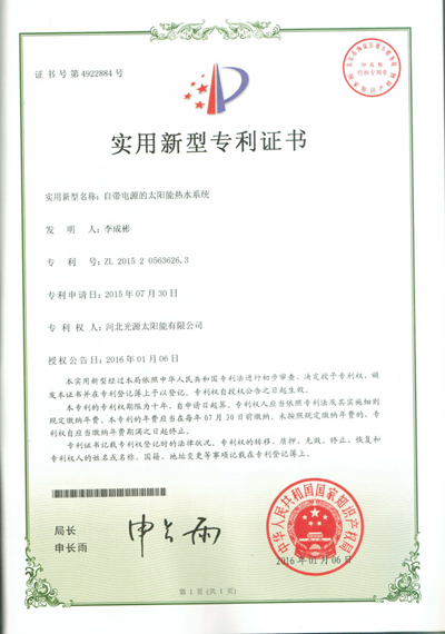 實(shí)用新型專(zhuān)利證書(shū)--自帶電源的太陽(yáng)能熱水系統(tǒng)