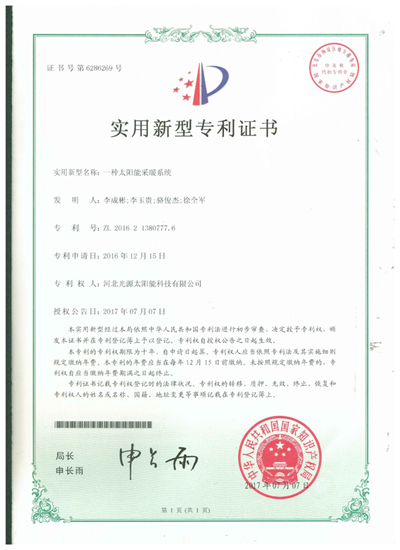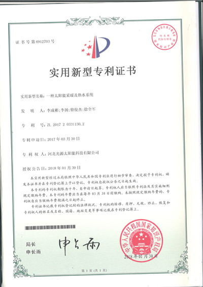 實(shí)用新型專(zhuān)利證書(shū)--一種太陽(yáng)能采暖系統(tǒng)