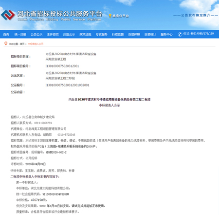 在抗疫的關(guān)鍵時期,復(fù)工復(fù)產(chǎn)正在如火如荼的進行,沒有什么能比一份中標(biāo)通知書更能振奮人心了。在營銷工作舉步艱難的特殊時期,河北光源太陽能科技有限公司,中標(biāo)內(nèi)丘縣2020年度農(nóng)村冬季清潔取暖設(shè)備采購及安裝工程,為我公司2020年度輝煌的經(jīng)營業(yè)績再添濃墨重彩的一筆。