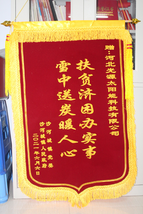 送人鮮花 留有余香 今天光源送給農(nóng)民壁掛爐,鎮(zhèn)黨委政府送來錦旗。錦旗上褒揚光源的14個大字就是余香:“扶貧濟困辦實事,雪中送碳暖人心”。這余香是鼓勵也是激勵,是褒揚也有希望。它鼓勵光源人要多做雪中送碳的人,激勵光源人多做扶貧濟困的事兒。光源人不會辜負(fù)這面錦旗。