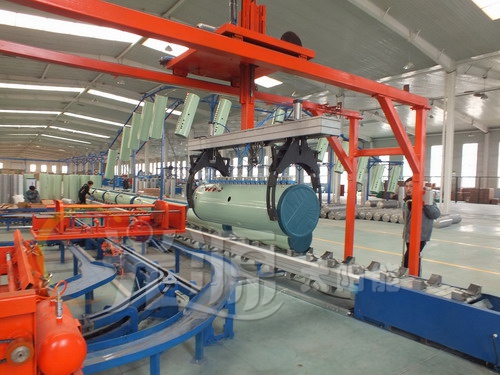 該生產(chǎn)線水箱發(fā)泡采用臥式無氟高壓定量一次發(fā)泡工藝,是國內(nèi)第一家,也是目前國內(nèi)最先進的發(fā)泡線;內(nèi)外桶組裝完成后由機械手自動抓取,放到工藝小車上,發(fā)泡完成后也由機械手來完成水箱的下件工作,減輕了工人的勞動強度,減少了搬運過程中的磕碰等現(xiàn)象;發(fā)泡完成后水箱由錐滾線和升降機自動運送到地下室,屬首家采用地下室恒溫保溫工藝,節(jié)約能源,保證生產(chǎn)出的水箱具有穩(wěn)定的質(zhì)量。