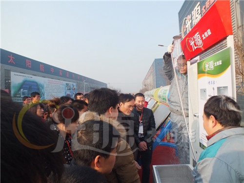 12月7日上午,光源公司邀請經(jīng)銷商朋友到廠區(qū)參觀并合影留念。光源公司在廠區(qū)的特定位置展示了光源的產(chǎn)品,尤其是新品的展示更安排了技術(shù)人員現(xiàn)場演示與講解,廣大經(jīng)銷商朋友對光源新品產(chǎn)生了濃厚的興趣,紛紛駐足光看,聆聽講解。7日下午,光源太陽能年會舉行訂貨會,活動現(xiàn)場氣氛熱烈,經(jīng)銷商朋友爭先恐后的簽訂購貨協(xié)議,訂貨量與去年持平。