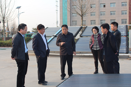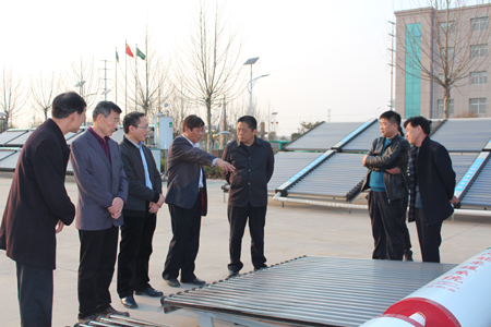聽取“太陽(yáng)能采暖系統(tǒng)”性能講解 周寶戰(zhàn)(左三)