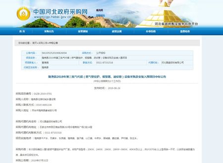 捷報頻傳, 熱烈祝賀我公司(河北光源太陽能科技有限公司)2019年08月22日中標隆堯縣2019年第三批氣代煤(燃氣壁掛爐、報警器、波紋管)設備采購及安裝入圍項目。本次中標又一次認可了我公司的產品質量,驗證了我公司的實力。