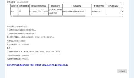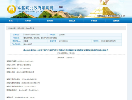 奮力拼搏創(chuàng)佳績(jī),捷報(bào)頻傳奏凱歌。河北光源太陽(yáng)能科技有限公司,在2019年09月27日,唐山市豐南區(qū)2019年第二批氣代煤燃?xì)獗趻鞝t及電代煤電取暖設(shè)備采購(gòu)及安裝項(xiàng)目A標(biāo)包第四標(biāo)段中標(biāo),為我公司2019年度輝煌的經(jīng)營(yíng)業(yè)績(jī)?cè)偬頋饽夭实囊还P。