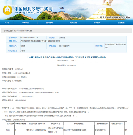 廣宗縣2020年冬季清潔取暖(氣代煤)設(shè)備采購(gòu)安裝項(xiàng)目中標(biāo)