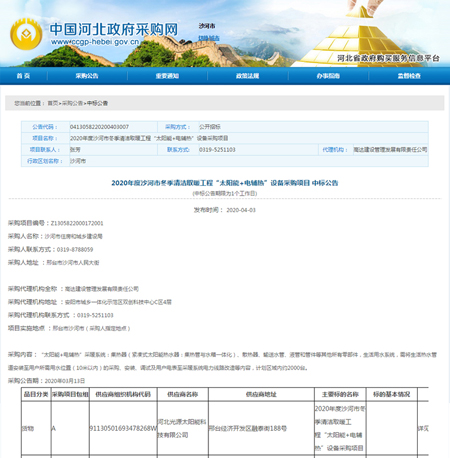 2020年度沙河市“太陽(yáng)能+電輔熱”設(shè)備采購(gòu)項(xiàng)目中標(biāo)