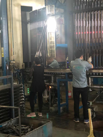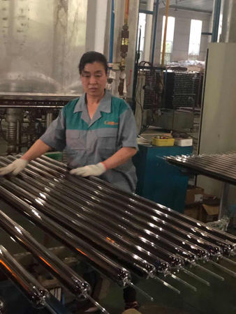 “五.一”這天,驕陽似火。室外溫度高達35度,真空管車間,在火考中作業(yè),工人們揮汗如雨戰(zhàn)高溫。他們的口號叫得響:寧流萬滴汗,不出一次品。